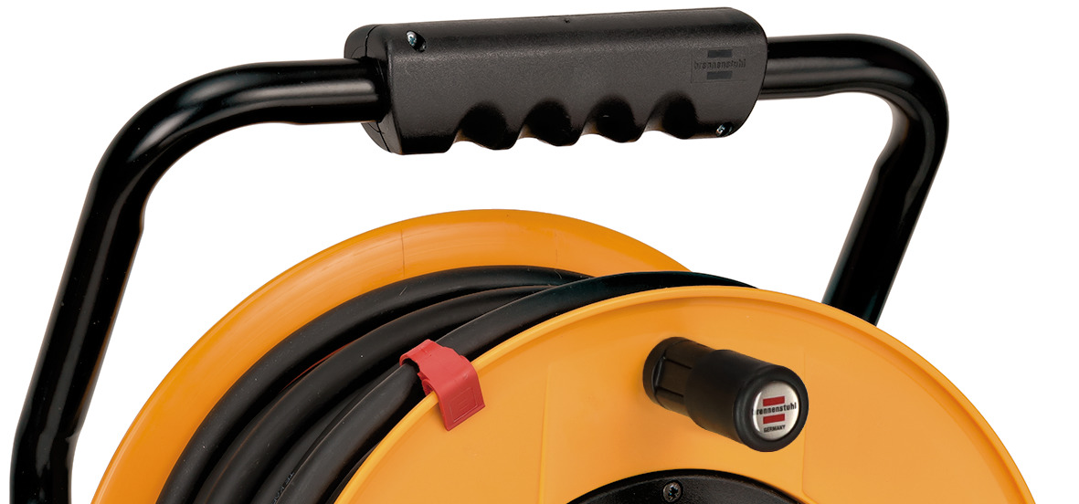 - Bastidor portante recubierto con capa pulverizada, particularmente estable. Cuerpo del enrollacables fabricado de plástico especial altamente resistente.